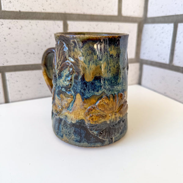 Wildflowers relief carved and abstractly glazed. NOTE - this piece is discounted due to a small aesthetic crack at the bottom of the mug. Totally functional - tested with boiling water!!