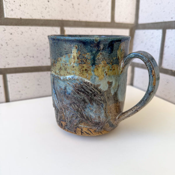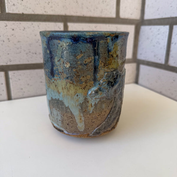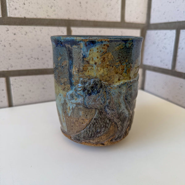Relief bear, mountains, and abstract glazes.