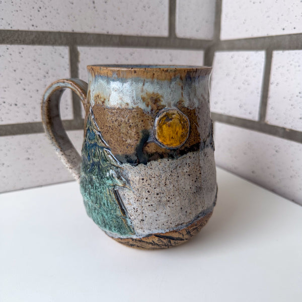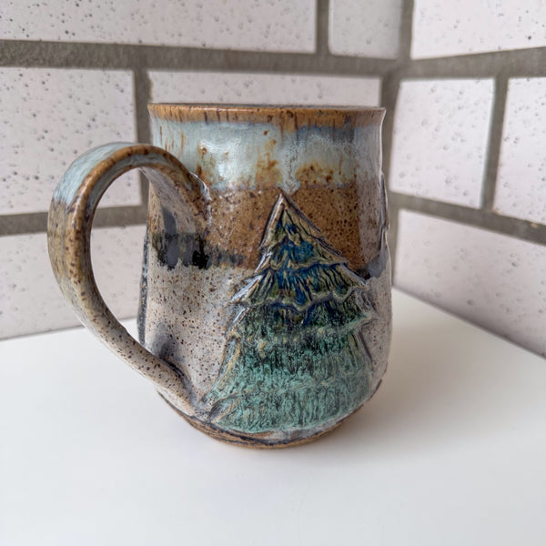 Relief carved mountains with bear, tree, abstract glazes.